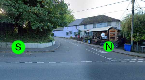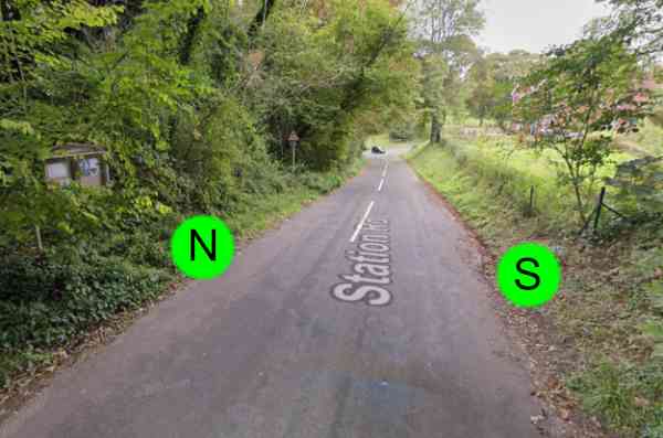 The stop is along Station Road near the junction with the B2150, where the road is slightly wider. The bus will come from the B2150, travelling south on Station Road (towards the camera in the picture below) for the service to Fareham (marked “S”). It will be travelling north on Station Road for the Petersfield and Winchester services (marked “N”).