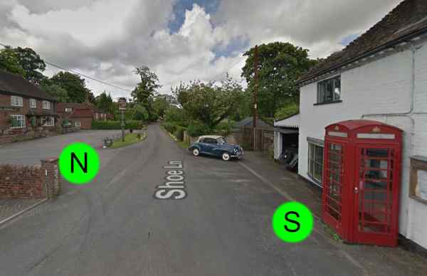 The bus stop is by the phone box opposite “The Shoe” public house for the southbound service to Fareham (marked S), and at the edge of “The Shoe” car park for the northbound service to Winchester (marked N).