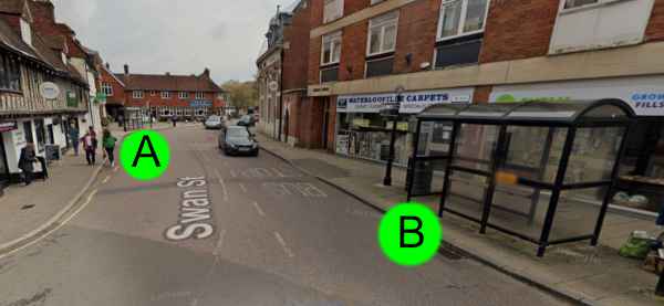 Both stops are marked as bus stops with shelters and signs “A” and “B”. On the outbound journey, the bus stops at stop A (near “Specsavers”); on the return journey it stops at stop B (near “Oxfam”).