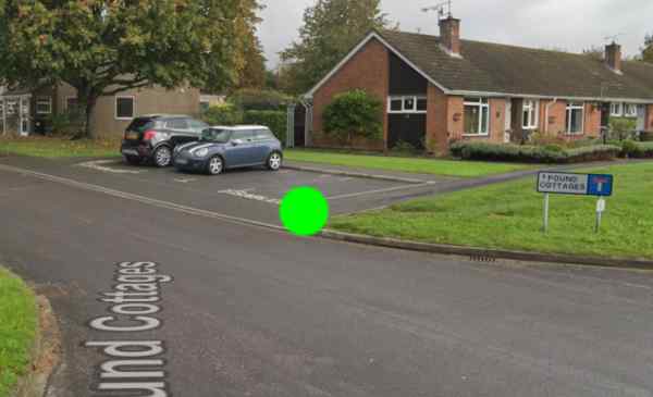 This stop is next to the disabled parking space nearest to the entrance of Pound Cottages. The bus will enter Pound Cottages, drive past the bus stop, then turn round before stopping at the bus stop.