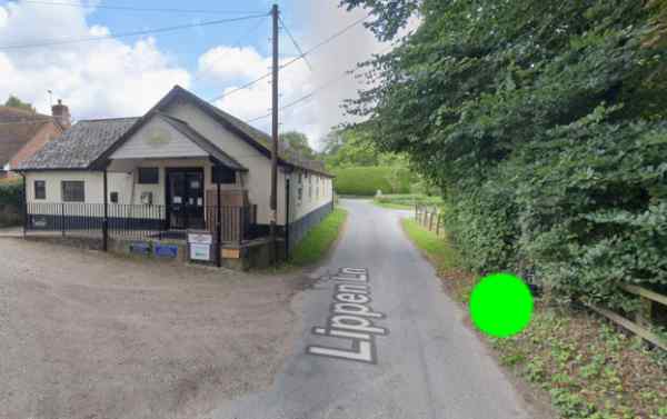 The stop is opposite the main entrance of the village hall. The bus will always be travelling south on Lippen Lane (towards the camera in the street view below).