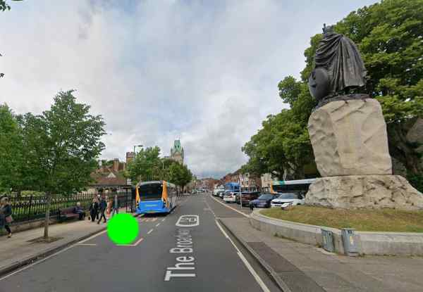 The bus stops at stand 7 on The Broadway. This is the stand closest to King Arthur’s Statue.