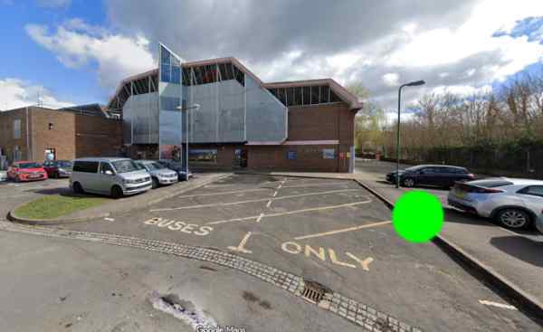 Outside River Park Leisure Centre, in the “Buses Only” bay.